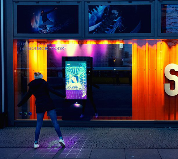 For the premiere of a new sneaker series, we created an installation which let the user flight through a "world of source code". The user interacts by moving with his body to avoid obstacles in his way. The storefront experience was placed simultaniously in several snipes stores in europe ( Paris, Amsterdam, Berlin ...).